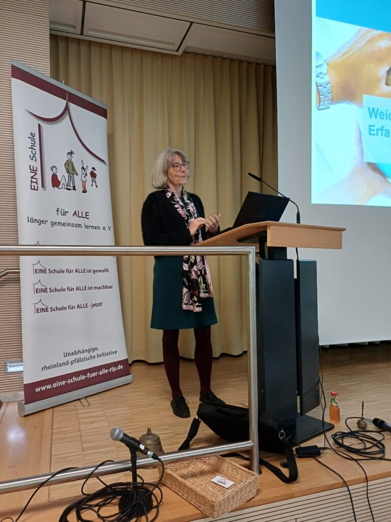 In ihrem Vortrag „Weichen stellen für Inklusion – Erfahrungen, Erkenntnisse, Ermutigungen“ wies Frau Prof. Dr. Annette Scheunpflug von der Universität Bamberg anfangs daraufhin, dass Bayern, Baden-Württemberg und Rheinland-Pfalz in einem Gutachten der WZB (Wissenschaftszentrum Berlin für Sozialforschung) 2021 als „Schlusslichter in der Umsetzung der Inklusion“ bezeichnet wurden.
