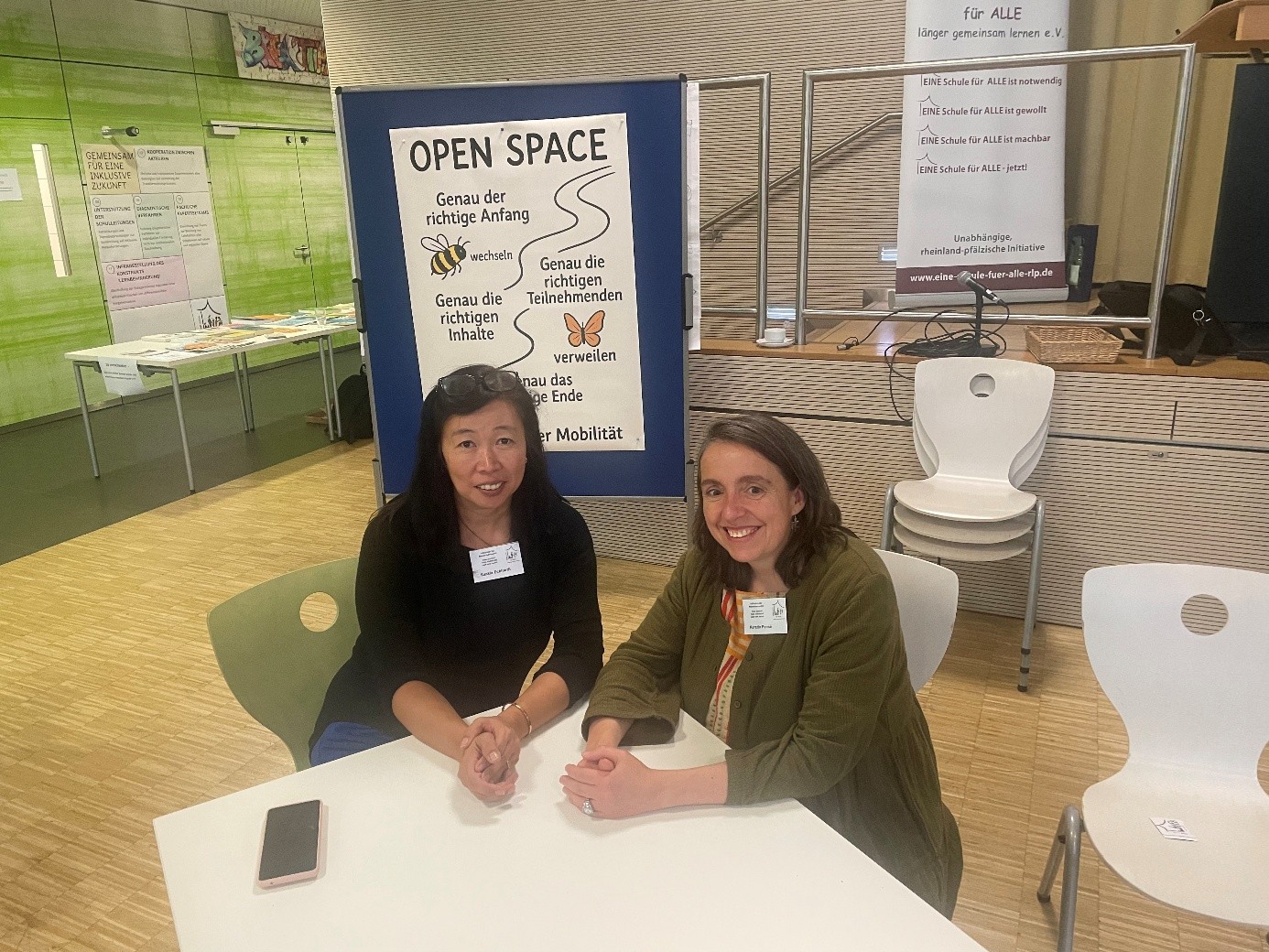 Saskia Eckhardt (Foto links) ist als Förderschullehrerin in der Inklusion tätig. Im weiteren Bereich arbeitet sie als Beraterin für Inklusion und Pädagogischen Schulbau am Pädagogischen Landesinstitut in Speyer Kerstin Pensé (Foto rechts) war zunächst Lehrerin in Schleswig-Holstein in inklusiven Kontexten, danach in RLP Förderschullehrerin an Förderschulen mit dem Förderschwerpunkt sozial-emotionale Entwicklung, Lernen und Sprache, externe Expertin für an Eis Schoul in Luxemburg, bis heute tätig an Schwerpunktschulen (SPS) im Raum Trier, 10 Jahre tätig als Inklusionsbeauftragte, seit 2014 Beraterin für Inklusion am Pädagogischen Landesinstitut in Rheinland-Pfalz.